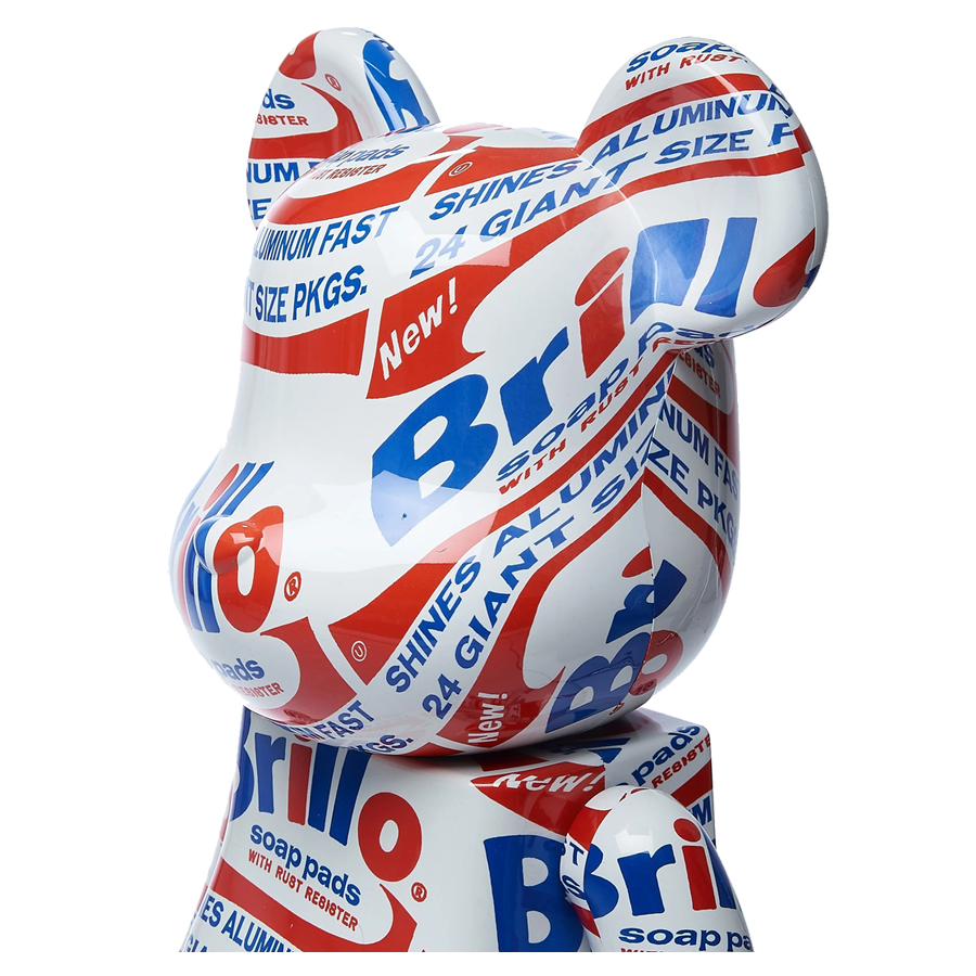 Deze Bearbrick heeft een all-over print van het kunstwerk “Brillo Boxes” van de beroemde kunstenaar uit de jaren 60, Andy Warhol. Die wordt herinnerd als de leidende figuur van de pop-art. Dit opmerkelijke werk leidde tot de discussie over hoe we iets als kunst identificeren en waarderen. Aangezien het een nauwkeurige kopie was van de commerciële Brillo-verpakking. Het portret en de handtekening van Andy Warhol zijn ook op de achterkant gedrukt.