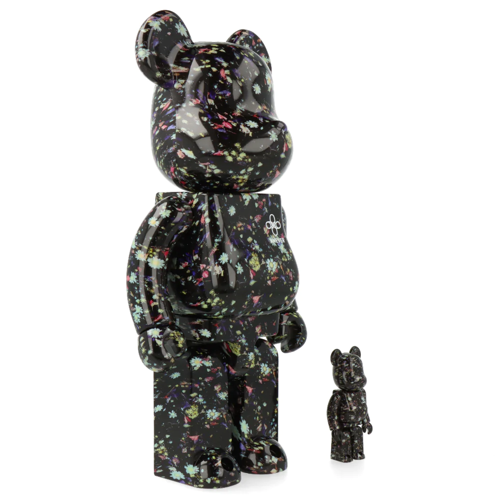 Met een zwarte basis is deze beer bezaaid met kleurrijke bloemen die hem tot een vrolijk beeldje maken. U vindt ook het merklogo van Anever op de voorkant van de Bearbrick.